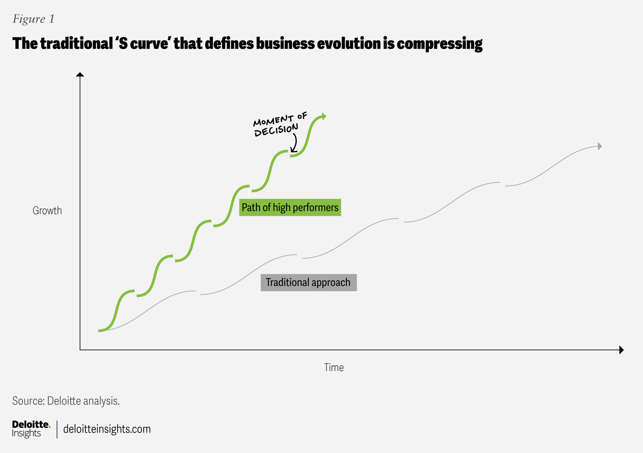 The classic S curve of growth has long described how businesses and work evolve: gradual lift, rapid acceleration, and eventual plateau. Today, that curve is compressing. AI and workforce transformation are accelerating the climb and bringing the plateau sooner (figure 1). Organizations are pressed to leap to the next curve more quickly to remain competitive. Long cycles of planning and predictable execution may no longer hold in a world where markets, technologies, and worker and customer expectations shift in real time. Success may now depend more on sensing change, experimenting quickly, and adapting continuously.