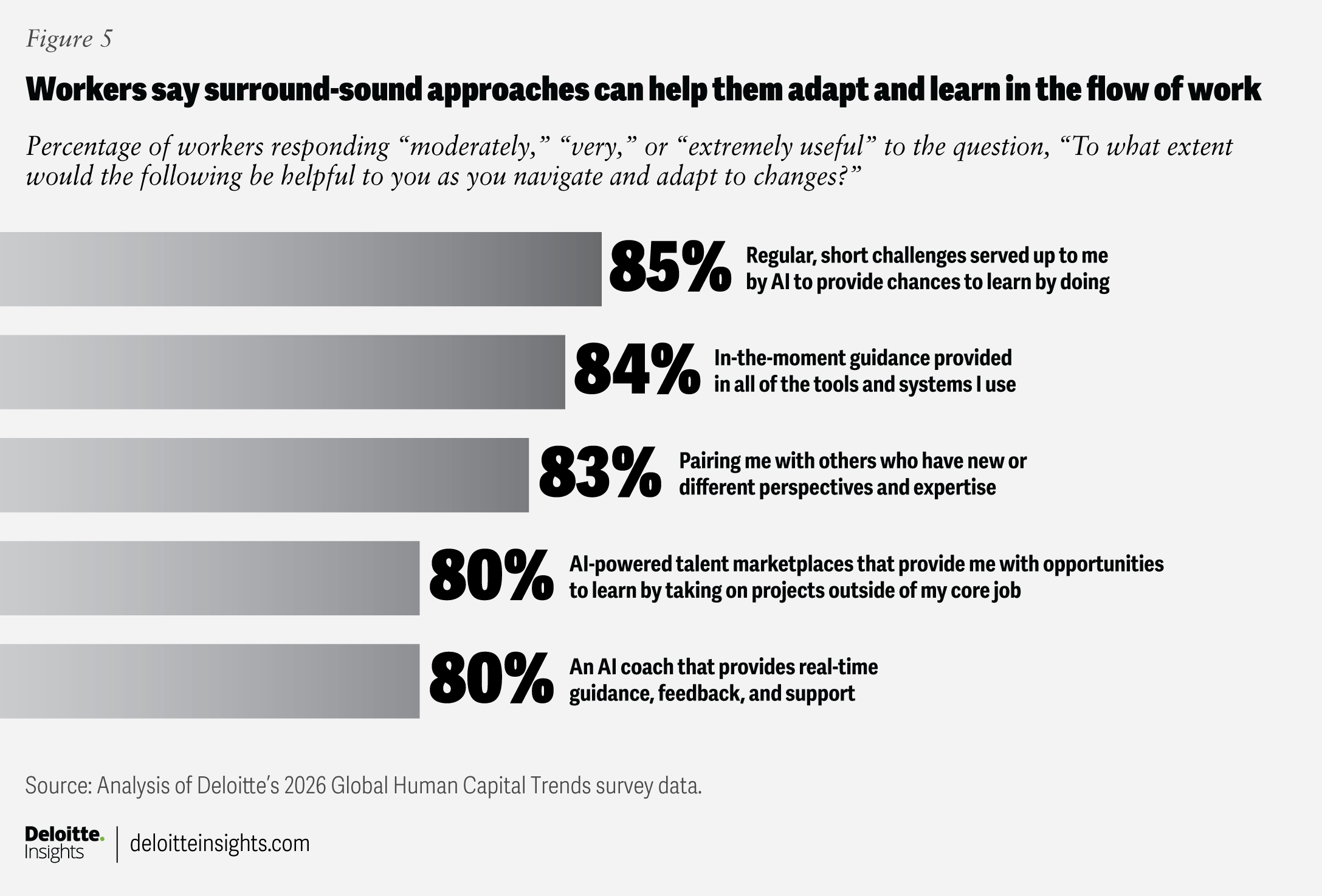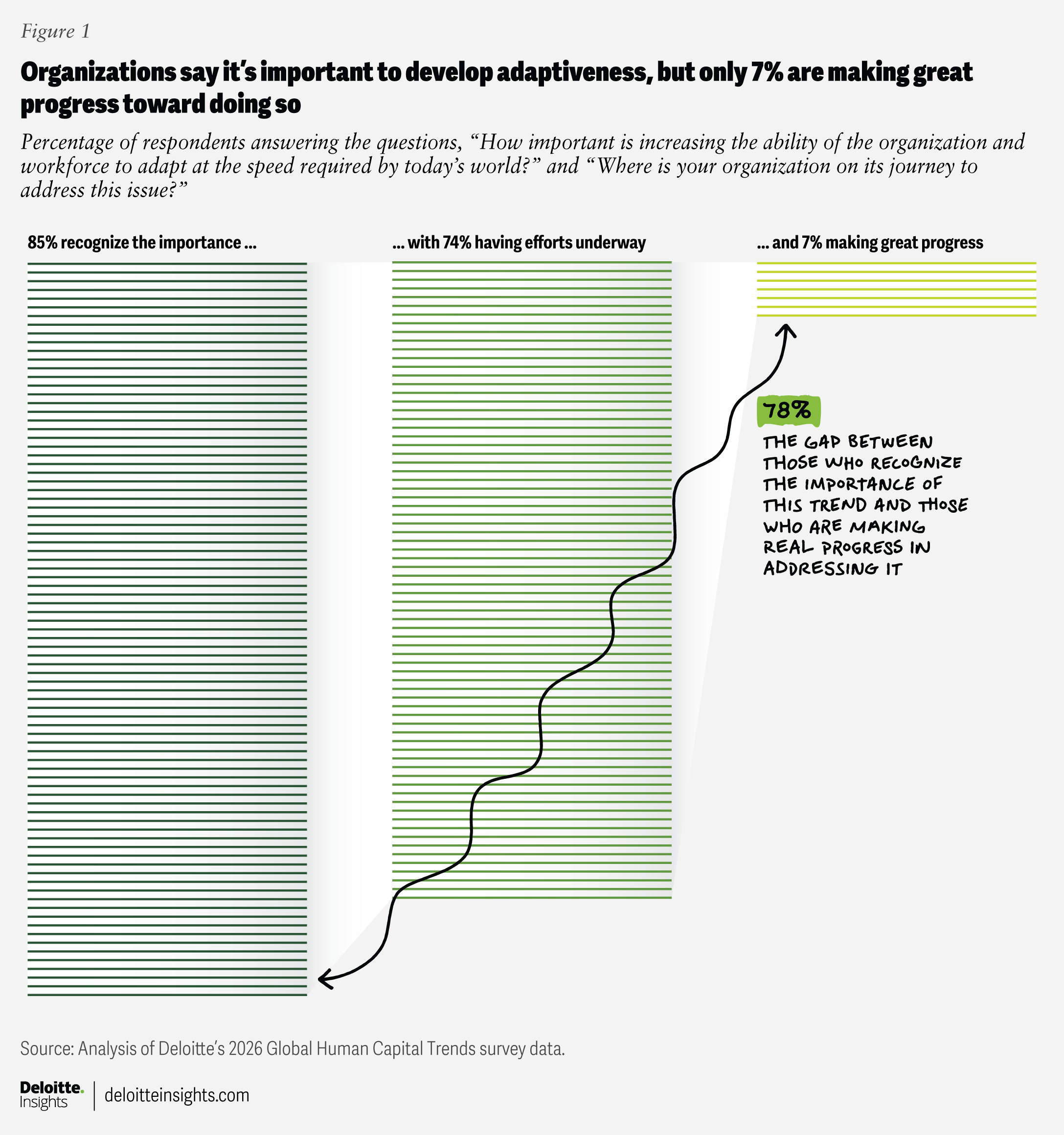 Creating an adaptive experience for workers is increasingly important. Respondents to our 2026 survey ranked it as the second most important trend this year, with 85% saying it is critical to develop the ability for the organization and the workforce to adapt at the speed required by today’s world. However, only 74% say they are making any kind of progress, and just 7% say they are leading in this area (figure 1).