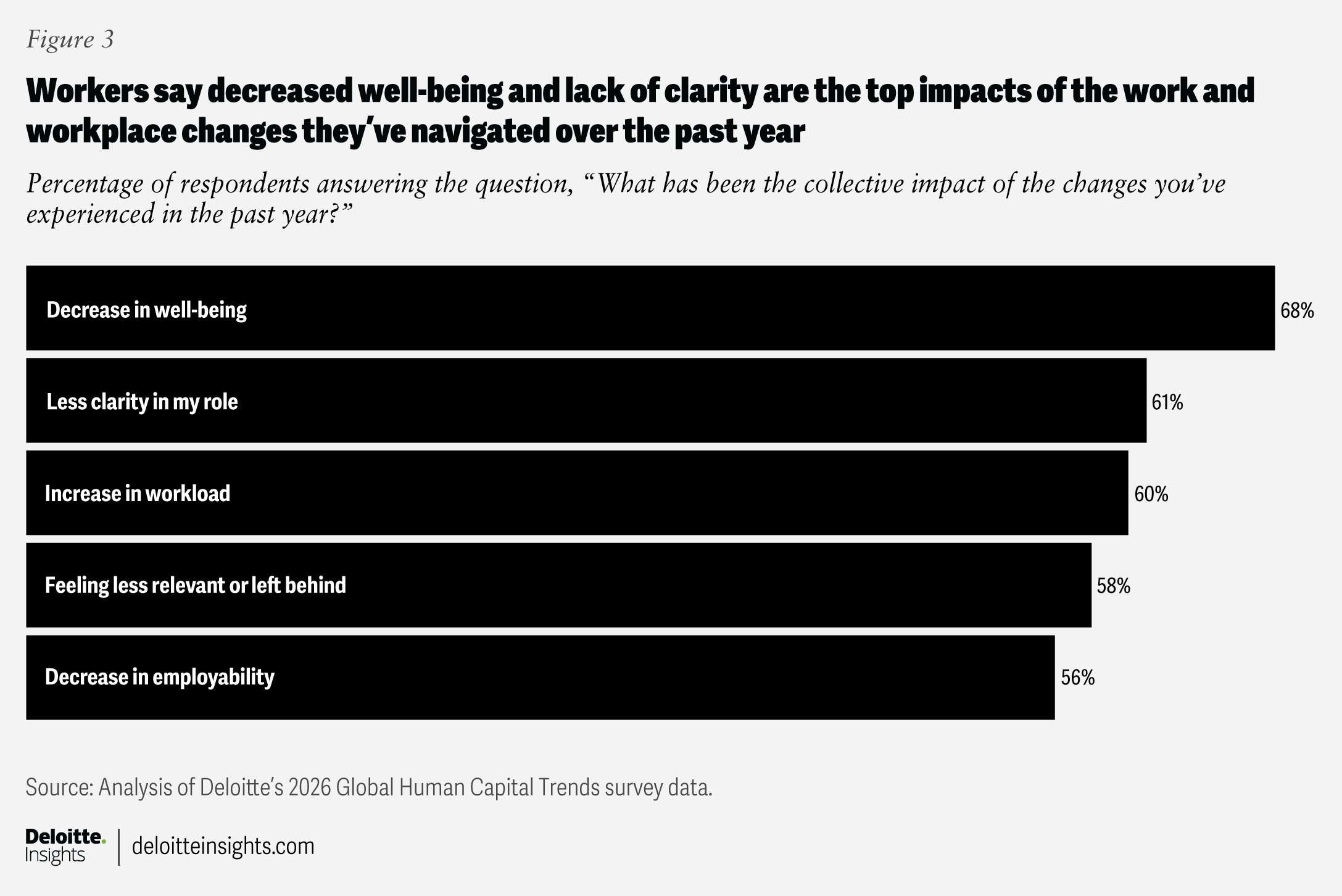 Any change will have an impact on workers. But as organizations respond to the accelerating pace of change through traditional approaches, the impact on workers can be negative. Our 2026 survey found that the steady cadence of organizational change has led to impacts such as decreased well-being (68%), increased workload (60%), and feeling less relevant or left behind (58%) (figure 3).