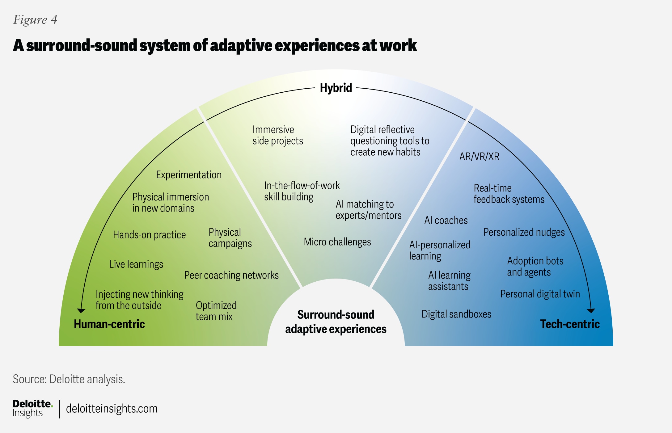 Organizations have been making progress with real-life experiences. These include optimizing the team mix so workers can learn from one another, peer coaching, and creating opportunities for hands-on practice and experimentation. But AI is changing the playing field, enabling far more opportunities to embed learning and change in the flow of work itself (figure 4).