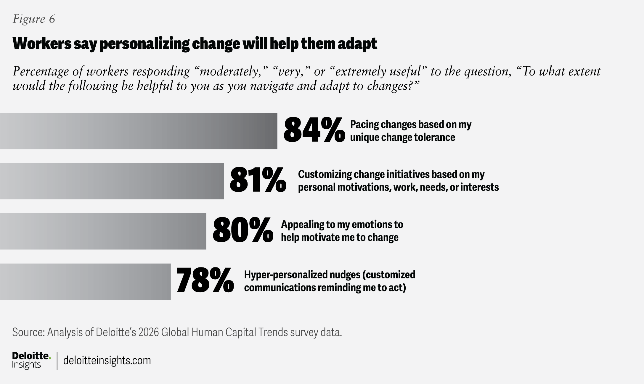 Workers say personalization will help them resolve some of the barriers that get in the way of adapting to change (figure 6). The top challenge cited by leaders and managers in our 2026 survey? Change not seeming directly relevant or personalized to the individual, cited by 44%. Barriers for workers include a lack of understanding of how the change relates to them (30% of respondents) and a lack of personal motivation to address the change (21%). Both of these barriers can be resolved when change is tailored to an individual’s work and motivations.