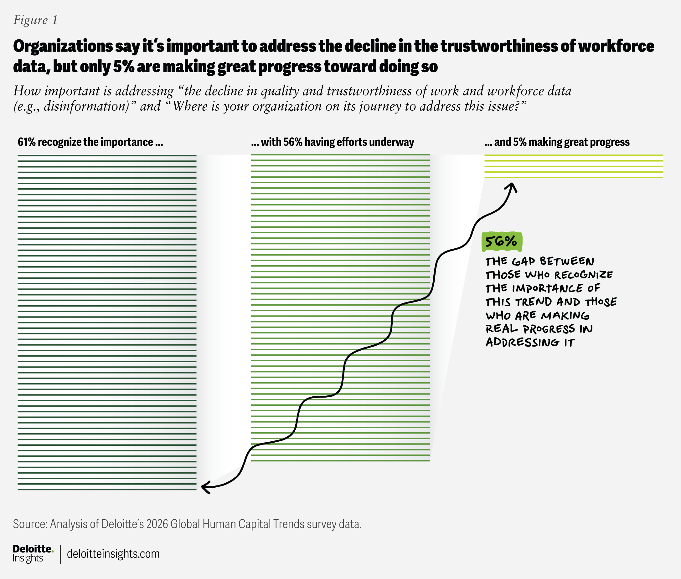 This is not a distant technological problem; it is a pressing business risk that could affect an organization’s brand, reputation, finances, and operational performance. Yet, according to Deloitte’s 2026 Global Human Capital Trends survey, only 5% of organizations are making great progress in addressing the decline in quality and trustworthiness of work and workforce data (figure 1). To address these challenges, organizations should consider expanding beyond cybersecurity to disinformation security and establishing a digital trust pact to protect worker-related data.