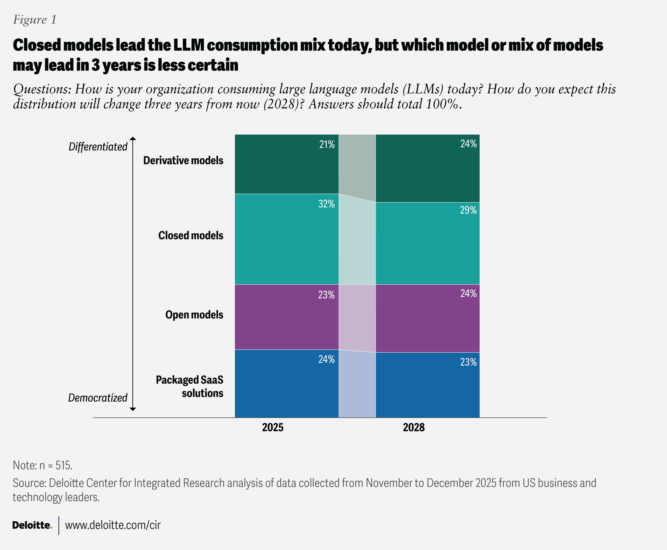 Beyond the survey, and based on Deloitte’s client experience, AI-first leaders are increasingly bullish on closed models, with usage among market leaders estimated at around 60% to 70%. Closed models provide differentiation via new capabilities for running sophisticated workloads, protecting sensitive data, and enabling monetization.3 Moreover, recent market moves—such as a major technology company shifting a previously open-source model to a proprietary one4—continue to shape strategies and reinforce this tilt toward closed solutions.