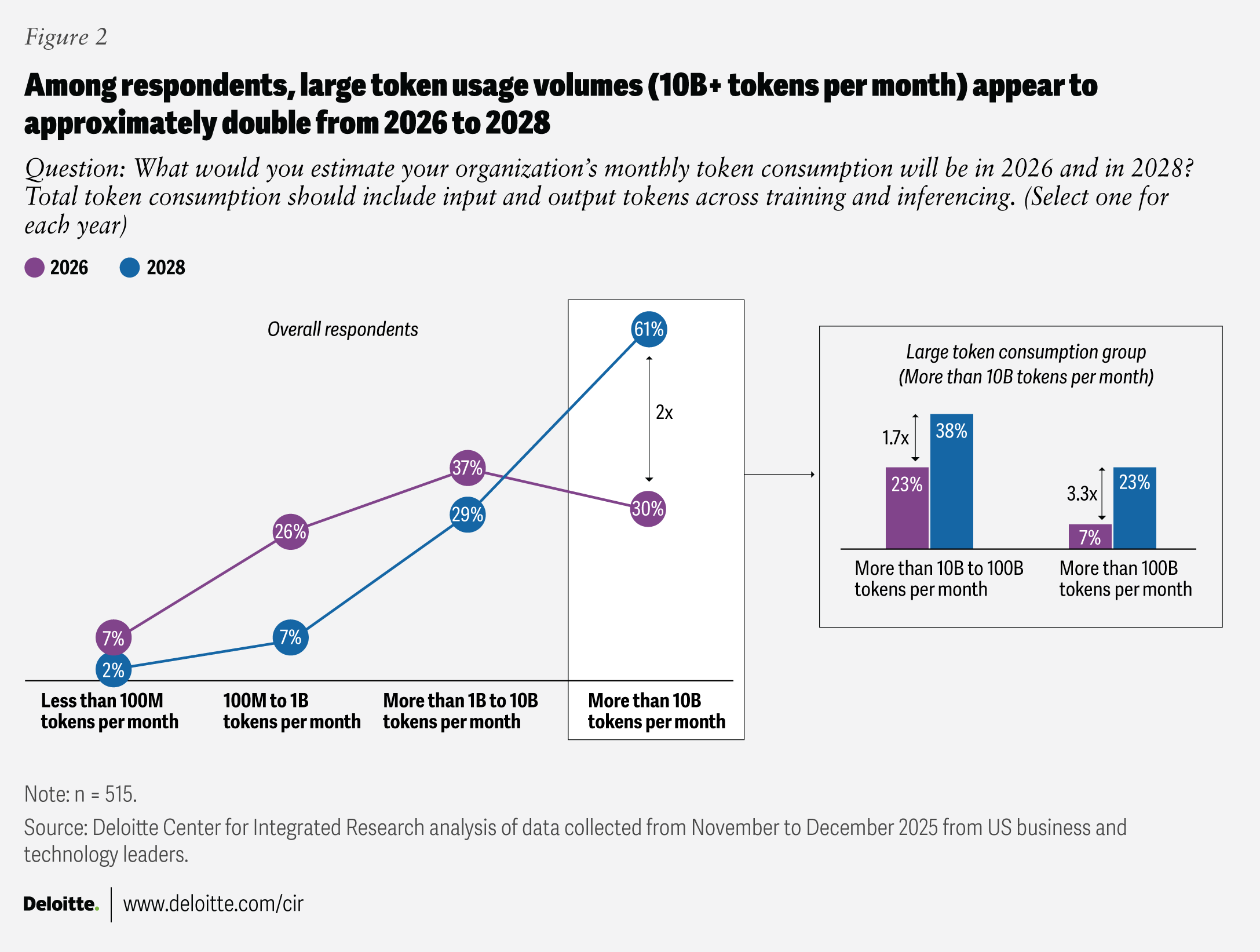 High complexity, bigger scale, and rising enthusiasm eventually compound to an explosion in token consumption. (An AI token is a unit of both compute and cost of AI applications and infrastructure.) Today, the largest proportion of respondents (37%) are consuming one billion to 10 billion tokens per month on average, and 30% are consuming more than 10 billion tokens per month. By 2028, 61% of respondents expect to consume more than 10 billion tokens per month on average, roughly doubling token consumption in about two years (figure 2). This increase is primarily driven by the rise in large token footprints of more than 100 billion tokens per month, reflecting a tripling of token use from 2026 to 2028.