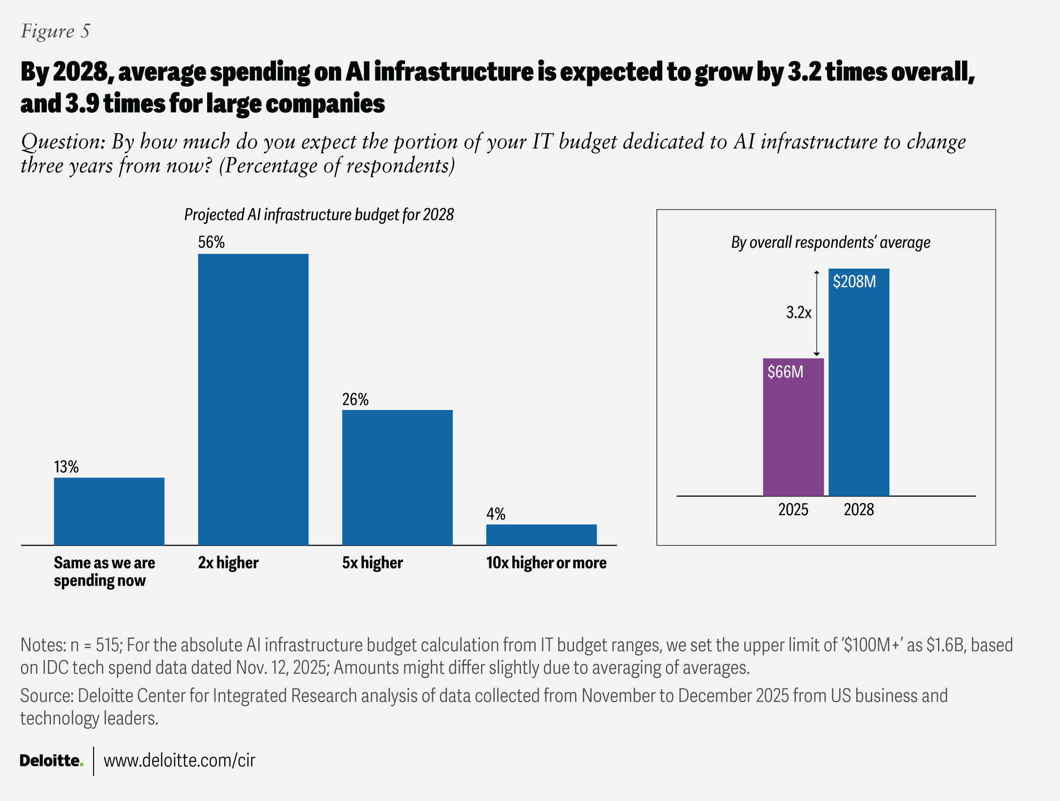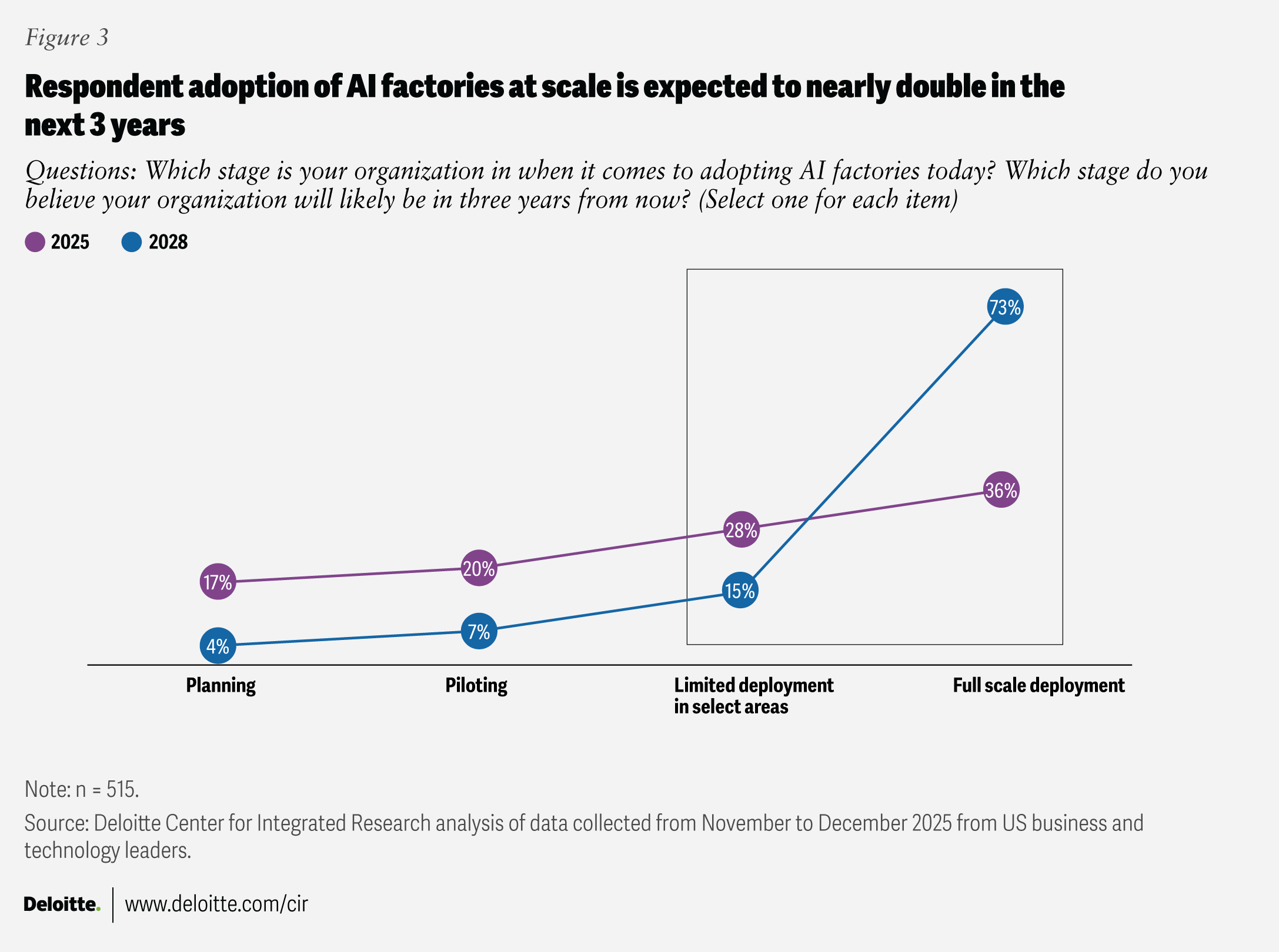 Artificial intelligence strategy is getting a reality check: Ambition isn’t the constraint to scaling, but infrastructure might be, according to Deloitte’s inaugural AI infrastructure survey. We surveyed 515 US leaders across five industries from enterprises with more than US$500 million in annual revenue in December 2025. Leaders were asked about their AI applications, engineering, and infrastructure scaling (see methodology). Over 70% of respondents expect to scale “AI factory” and “AI at the edge” deployments (AI computing near the data source, with minimal reliance on centralized cloud) by 2028, roughly doubling current adoption levels in three years. This growth trajectory would make hybrid AI (combining multiple “intelligence” approaches to solve a problem) and distributed AI (computing that occurs in multiple places at once) a reality for chief information officers, requiring significant transformation.