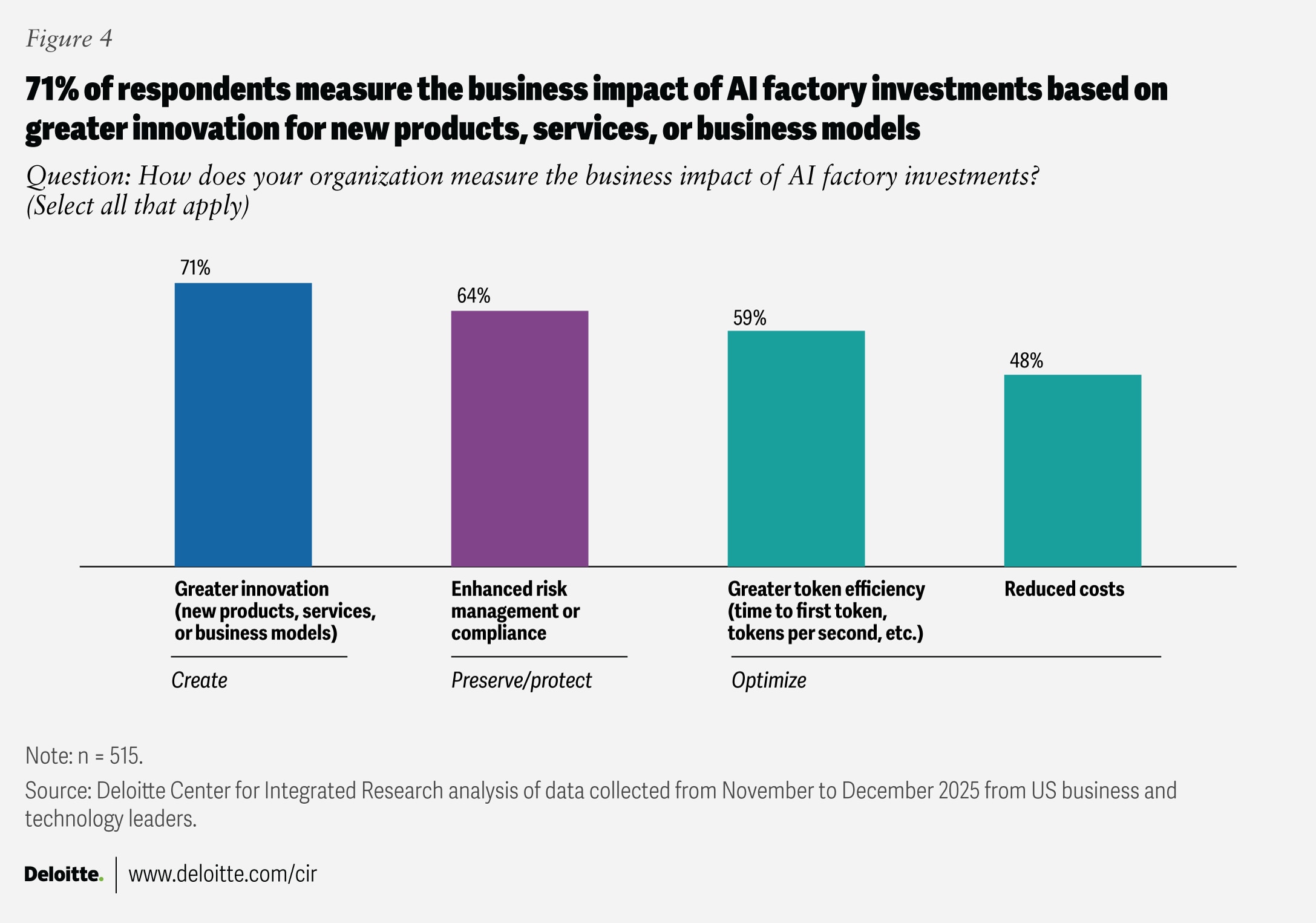 Despite these hurdles, the vast majority (71%) of respondents expect that AI factories will support innovation, risk management (64%), and token optimization objectives (59%) (figure 4).