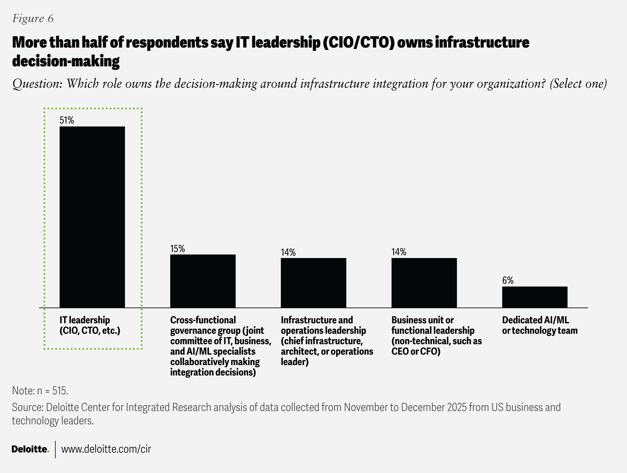 Despite the business and financial implications, AI decision-making is still primarily IT-led. More than half (51%) of respondents say IT leadership (CIOs or CTOs) owns decision-making around infrastructure integration. The other half are split almost evenly across governance (15%), infrastructure (14%), functional (14%), or specialist AI teams (6%) (figure 6). Based on Deloitte’s experience, that isn’t inherently problematic, as IT leaders are proactively pivoting existing data centers and identifying new sites to enable the business. They recognize that today’s application stacks are predominantly CPU-based, but the future operating model must deliver across both CPUs and GPUs. As a result, we’ve observed that CIOs and CTOs are increasingly getting ahead of these decisions to align platform readiness with business demand.