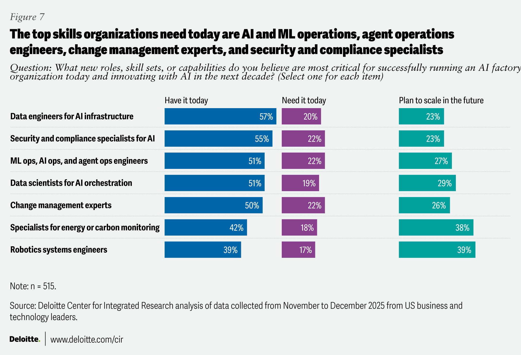 While many AI programs have the funding needed to scale, at least for now, talent remains an issue. First, there’s a skills gap: While many respondents (more than 50%) noted that their organizations have data engineers, security and compliance specialists, AI and machine learning (ML) and agent operations engineers, and data scientists, the talent needed to scale and innovate with AI isn’t fully met (figure 7). Organizations may need more security and compliance specialists and AI and ML and agent operations engineers, as well as change management experts, because success often lies in AI’s reliable adoption in day-to-day workflows rather than mere deployment. In the future, many organizations may be looking to scale skills like robotics systems engineering and carbon and energy monitoring, signaling a move toward physical automation and justifiable energy performance.